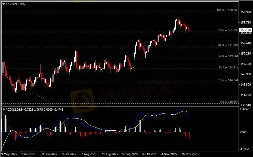 日线图显示美元兑日元震荡走弱,当前逼近154.80支撑。从MACD来看,快慢线向下运行,红色动能柱温和放量。汇价走势基本和动能柱的变化一致。