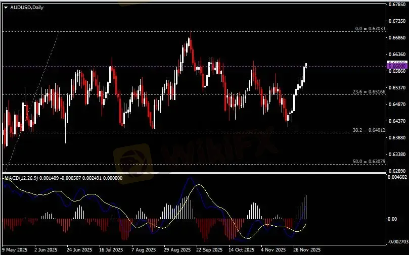 日线图显示澳元兑美元震荡走强,当前测试0.66关键阻力。从MACD来看,快慢线向上扩张,白色动能柱持续放量。汇价走势基本和动能柱的变化一致。
