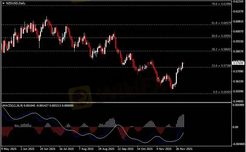日线图显示纽元兑美元震荡上行,当前收于前高0.5740。从MACD来看,快慢线向上扩张,白色动能柱则略显收缩。汇价走势和动能柱的变化呈分歧。