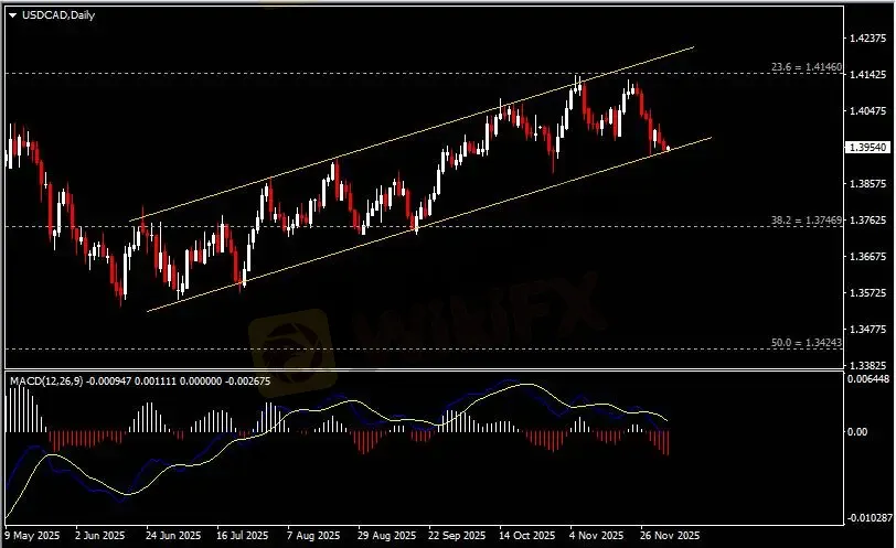 日线图显示美元兑加元震荡下跌,当前测试上行通道底线。从MACD来看,快慢线向下运行,红色动能柱温和增量。汇价走势基本和动能柱的变化一致。