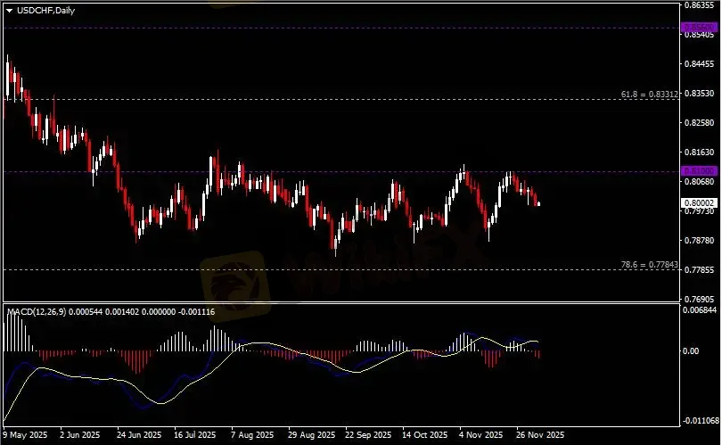 日线图显示美元兑瑞郎回调走弱,当前承压于0.81关键阻力。从MACD来看,快慢线死叉依旧,红色动能柱温和增量。汇价走势基本和动能柱的变化一致。
