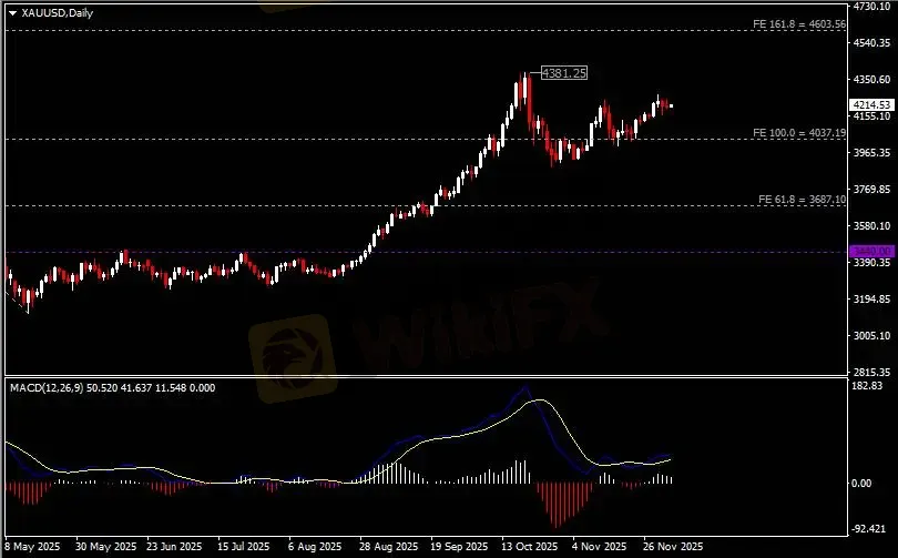 日线图显示金价小幅回调,当前仍企稳于4040支撑。从MACD来看,快慢线向上运行,白色动能柱则温和收缩。金价走势基本和动能柱的变化一致。