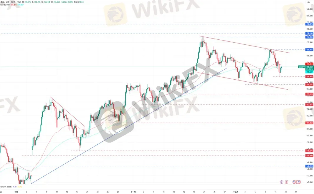 周四,美元/日元下跌至155.576日元。美元方面,根据美国劳工部最新数据,美国截至12月6日当周的初请失业金人数为23.6万人,高于市场预期的22万人,也较前值19.2万人大幅回升。另一方面,美元受到鲍威尔继任人选的猜测升温而承压,因被认为立场较鸽派的白宫经济顾问哈塞特可能遭提名,使美元面临更大下行压力。日本方面,路透社调查显示,多数经济学家预期日本央行将在12月会议上加息25个基点至0.75%,并在明年9月底前将借贷成本至少提高至1%。此前,日本央行行长植田和男指出,日本央行对前景实现的确定性正逐步提升。