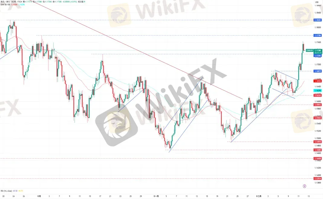 欧元/美元在图表上形成上涨旗型的看涨型态后进一步上涨,尽管受EMA50均线支撑前景保持看涨,但RSI指针已进入超买区域,须注意价格短期回落的风险。上涨方面,欧元/美元目前的阻力为10月1日的高点1.17786,再来是9月23日的高点1.18201。下跌方面,若回落至EMA50均线下方,欧元/美元目前的支撑为12月11日的低点1.16822,再来是12月8日的低点1.16163。