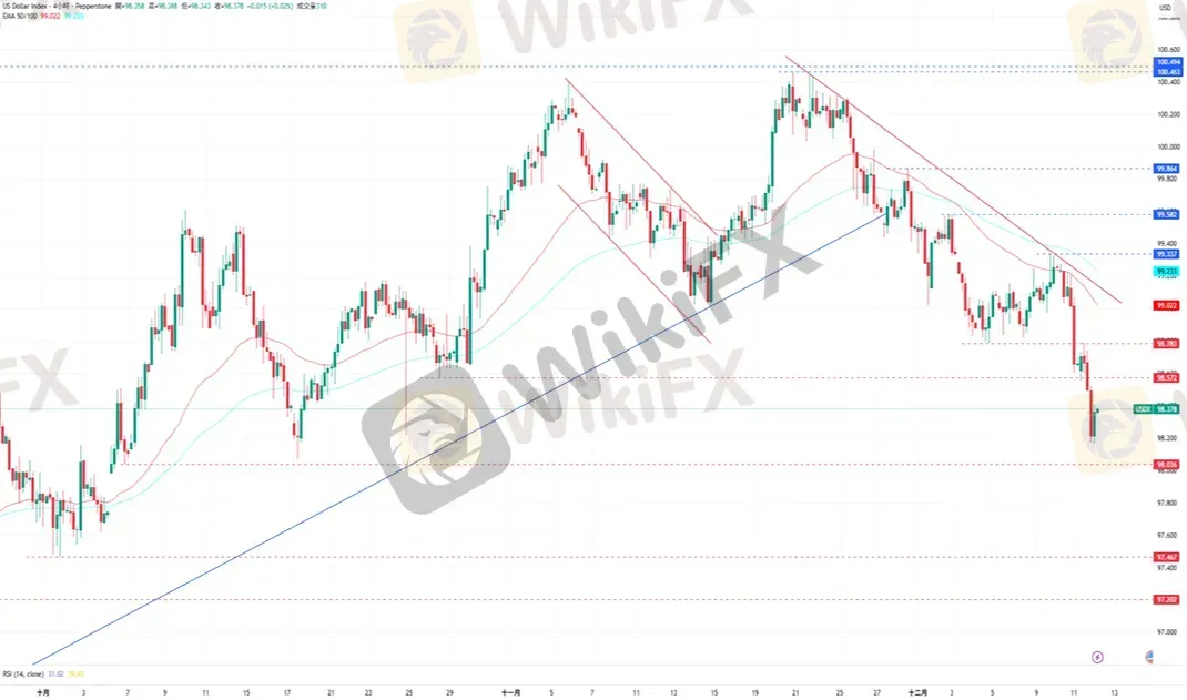 CPT Markets分析师指出,美元指数自98.163收复部分跌幅,以消化RSI指针的超卖讯号,由于价格仍低于下跌区域线以及EMA50均线,因此走势仍偏向看跌。下跌方面,美元指数接下来的支撑为12月11日的低点98.163,接着是10月17日的低点98.069。上涨方面,美元指数目前的阻力为12月11日的高点98.788,再来是12月9日的高点99.337。