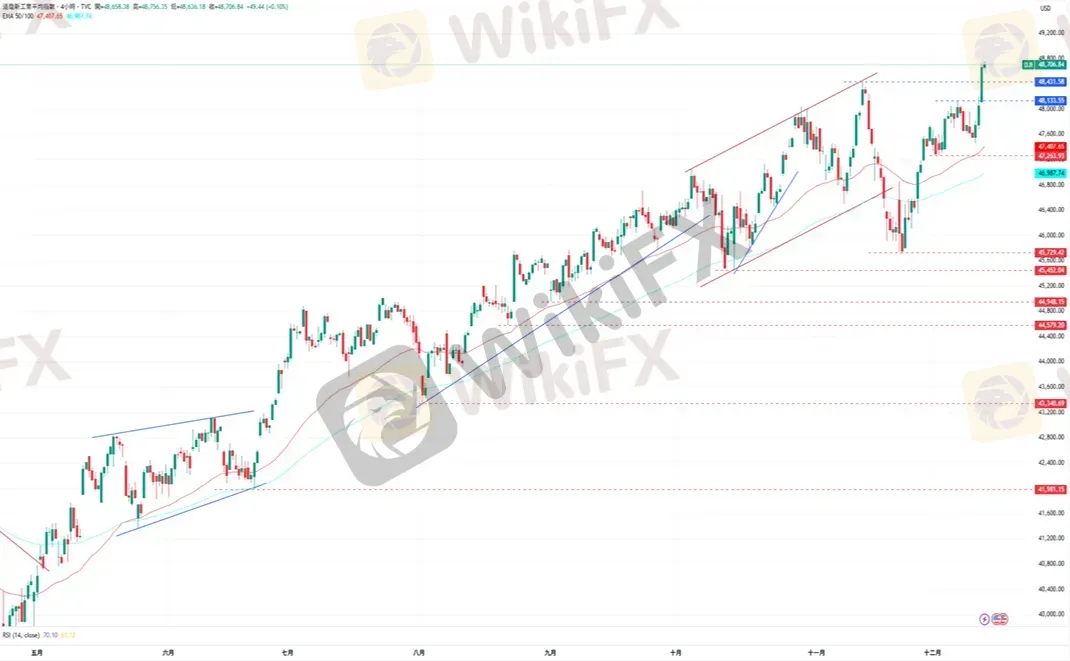 道琼指数再突破48431点后再创历史新高,须注意由于RSI指针进入超买区域,须注意短期回落的风险。上涨方面,道琼指数目前的阻力为12月11日的高点48756点,再来是49000点水平。下跌方面,道琼指数目前的支撑为12月10日的低点47462点,接着为12月2日的低点47263点。