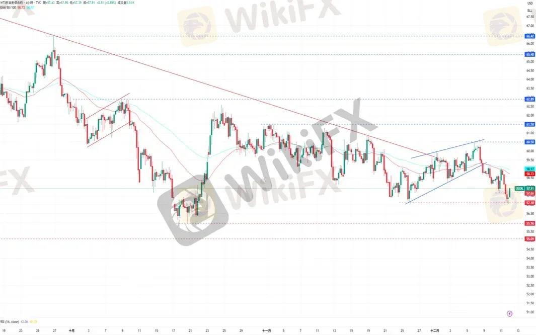 WTI原油自57.01水平反弹,由于价格保持在EMA50均线下方,因此目前走势仍偏向看跌。下跌方面,WTI原油目前的支撑为12月11日的低点57.01美元,再来是11月25日的低点57.10美元。上涨方面,WTI原油目前的阻力为12月10日的高点59.05美元,再来是12月5日的高点60.50美元。