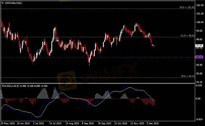 日线图显示美元指数震荡下挫,当前承压于98.80阻力。从MACD来看,快慢线向下运行,红色动能柱温和放量。指数走势基本和动能柱的变化一致。