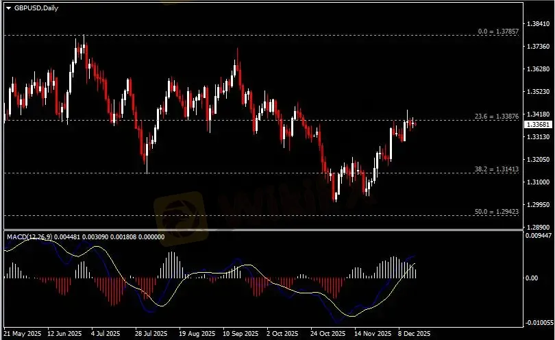 日线图显示英镑兑美元遇阻回落,当前承压于1.3390阻力。从MACD来看,快慢线呈拐向,白色动能柱温和收缩。汇价走势基本和动能柱的变化一致。
