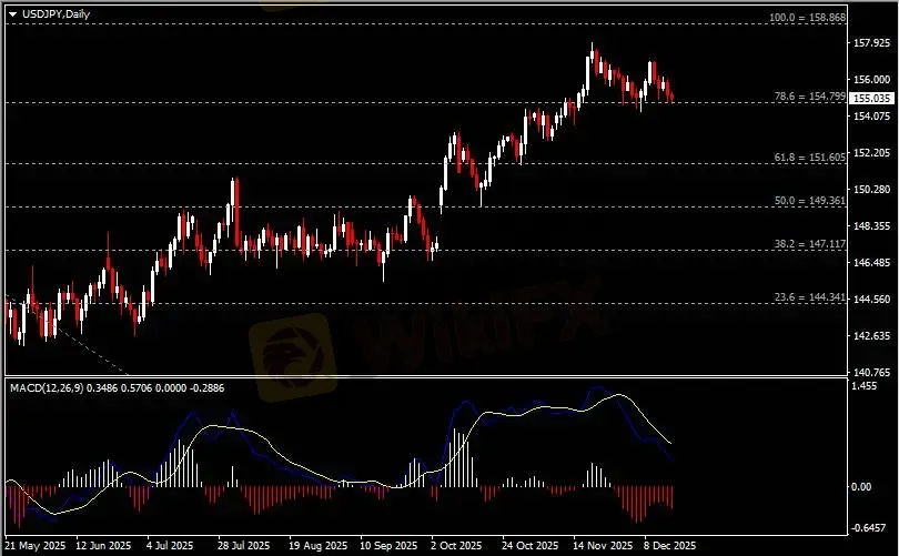 日线图显示美元兑日元震荡下跌,当前回测154.80支撑。从MACD来看,快慢线向下运行,红色动能柱温和放量。汇价走势基本和动能柱的变化一致。