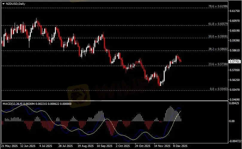 日线图显示纽元兑美元回调走弱,当前仍收于0.5740支撑。从MACD来看,快慢线呈拐向,白色动能柱温和收缩。汇价走势基本和动能柱的变化一致。