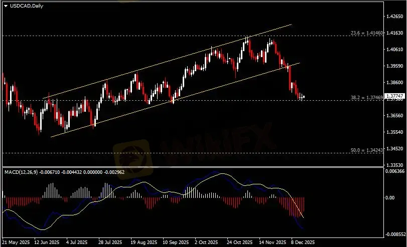 日线图显示美元兑加元跌势暂缓,当前收于1.3750支撑。从MACD来看,快慢线向下运行,红色动能柱则温和收缩。汇价走势基本和动能柱的变化一致。