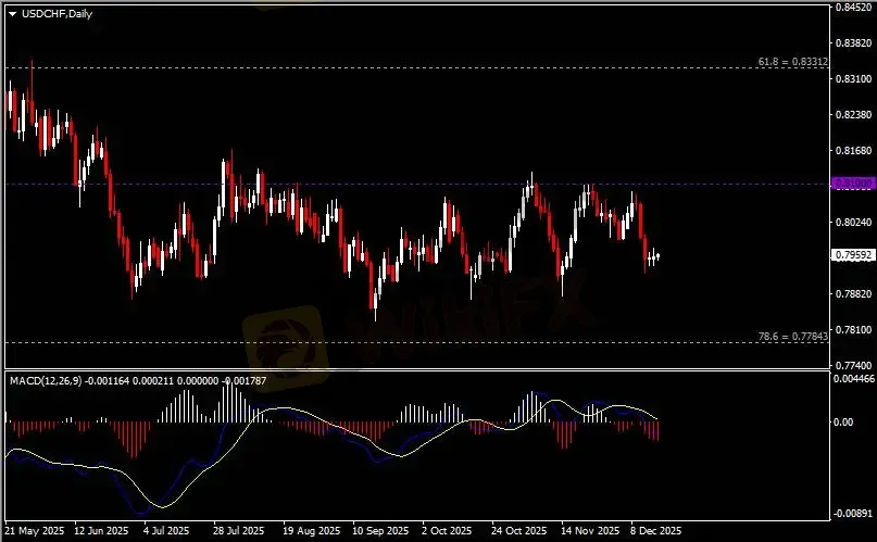 日线图显示美元兑瑞郎跌势暂缓,当前仍承压于0.81关键阻力。从MACD来看,快慢线向下运行,红色动能柱温和放量。汇价走势和动能柱的变化呈分歧。