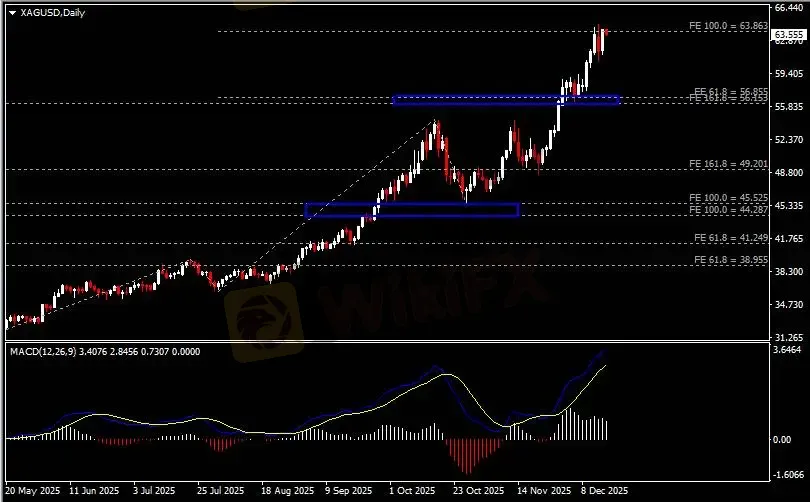 日线图显示银价震荡上涨,当前测试63.90阻力。从MACD来看,快慢线向上运行,白色动能柱温和收缩。银价走势和动能柱的变化呈分歧。