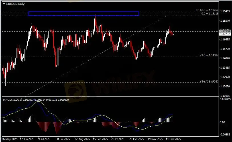 日线图显示欧元兑美元高位回调,当前承压于1.1750阻力。从MACD来看,快慢线呈拐向,白色动能柱温和收缩。汇价走势基本和动能柱的变化一致。
