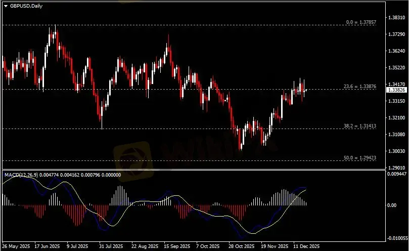 日线图显示英镑兑美元于区间震荡,当前测试1.3390阻力。从MACD来看,快慢线逐渐收窄,白色动能柱温和收缩。汇价走势基本和动能柱的变化一致。