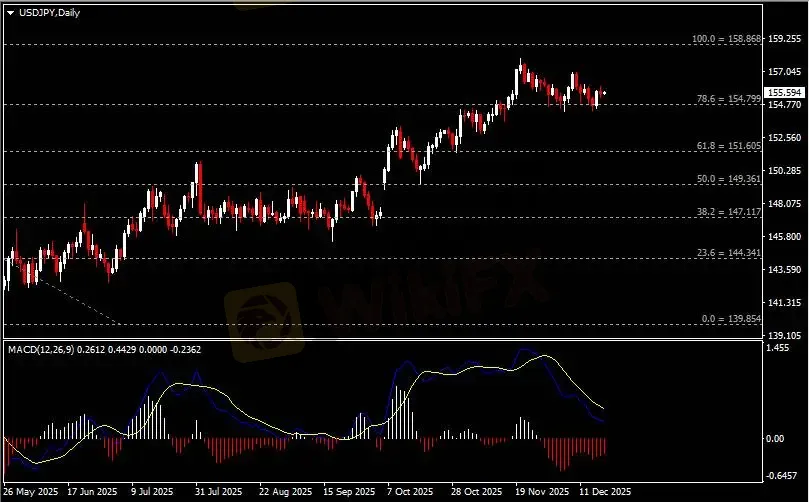 日线图显示美元兑日元小幅回落,当前仍收于154.80支撑。从MACD来看,快慢线向下运行,红色动能柱则温和收缩。汇价走势和动能柱的变化呈分歧。