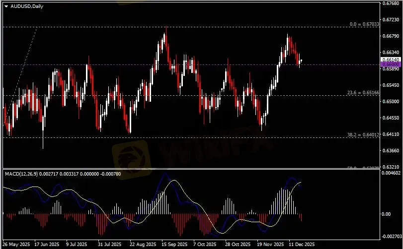 日线图显示澳元兑美元企稳收涨于0.66关键支撑。从MACD来看,快慢线死叉依旧,红色动能柱温和放量。汇价走势和动能柱的变化呈分歧。