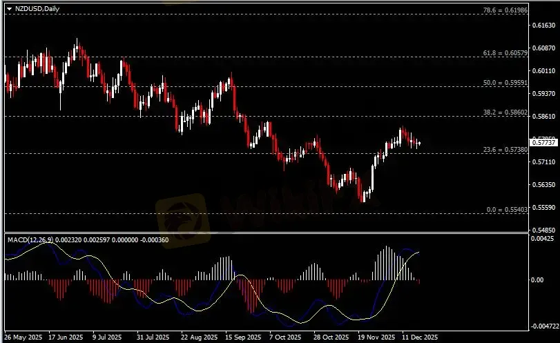 日线图显示纽元兑美元回调走弱,当前仍收于0.5740支撑。从MACD来看,快慢线形成死叉,红色动能柱温和增量。汇价走势和动能柱的变化呈分歧。