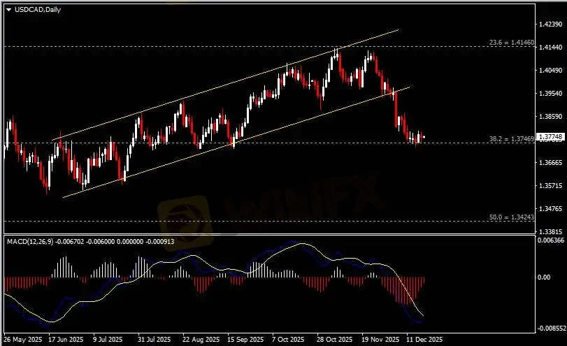 日线图显示美元兑加元震荡下跌,当前仍收于1.3750支撑。从MACD来看,快慢线呈拐向,红色动能柱温和收缩。汇价走势和动能柱的变化呈分歧。