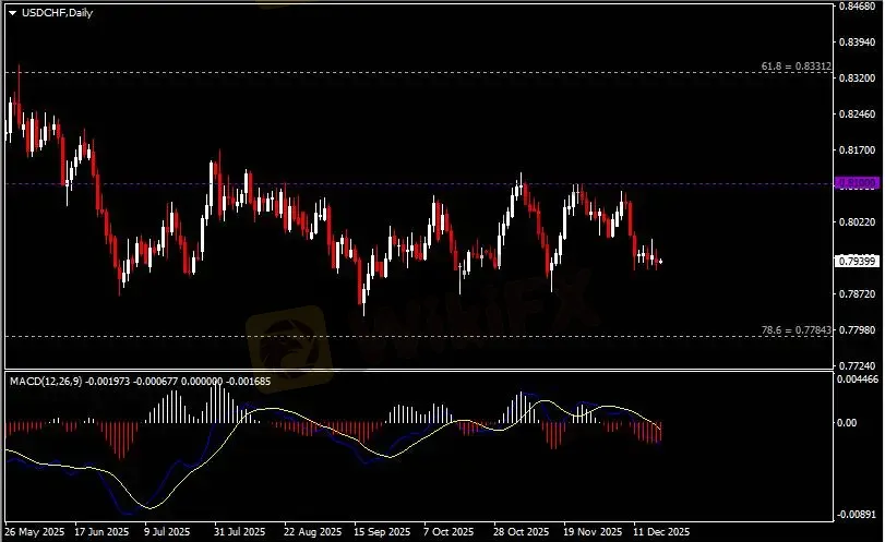 日线图显示美元兑瑞郎震荡下跌,当前承压于0.81关键阻力。从MACD来看,快慢线向下运行,红色动能柱则温和收缩。汇价走势和动能柱的变化呈分歧。
