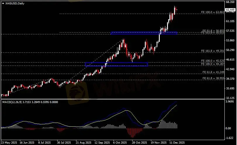 日线图显示银价高位回调,当前收于63.90支撑。从MACD来看,快慢线向上运行,白色动能柱则温和收缩。银价走势基本和动能柱的变化一致。