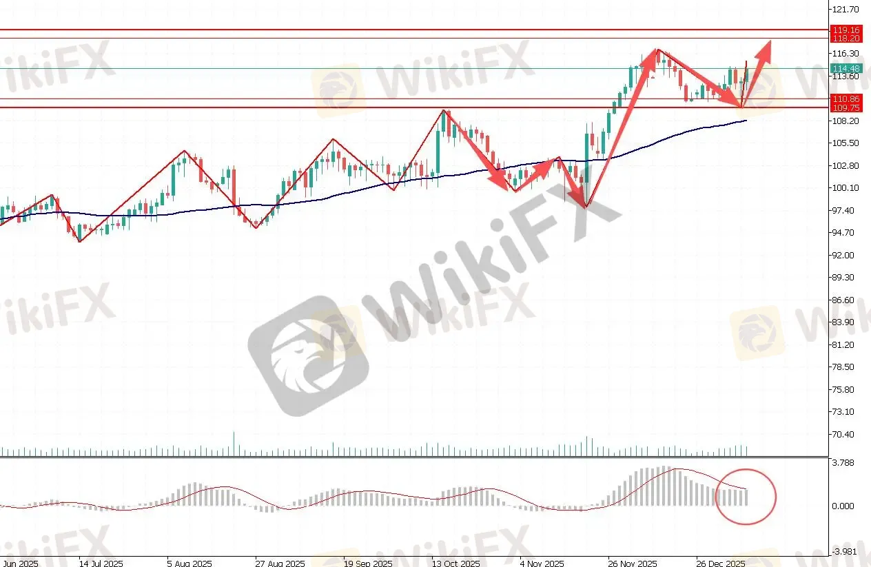 基本面:数据显示,日本2025年11月家庭支出大幅飙升,这引发市场对日本央行可能加息的猜测,并使美元兑日元的走势备受关注。家庭支出数据与11月薪资增长数据形成鲜明对比,后者暗示年底消费可能出现回落,消费疲软对日元造成下行压力。考虑到美联储未来降息和日本央行最终加息的前景,美元兑日元的后市走势可能走弱。