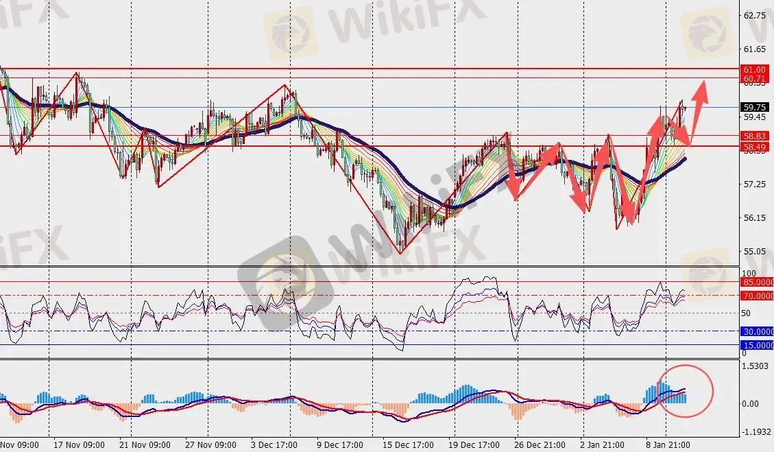 技术面:原油H4级别持续上涨,并在48日多空分界线上方运行。然而,MACD双线和量能柱在零轴附近再次缩量。全球石油库存上升意味着,除非出现重大供应中断或欧佩克减产,否则市场再平衡很可能需要2026年油价进一步走低。