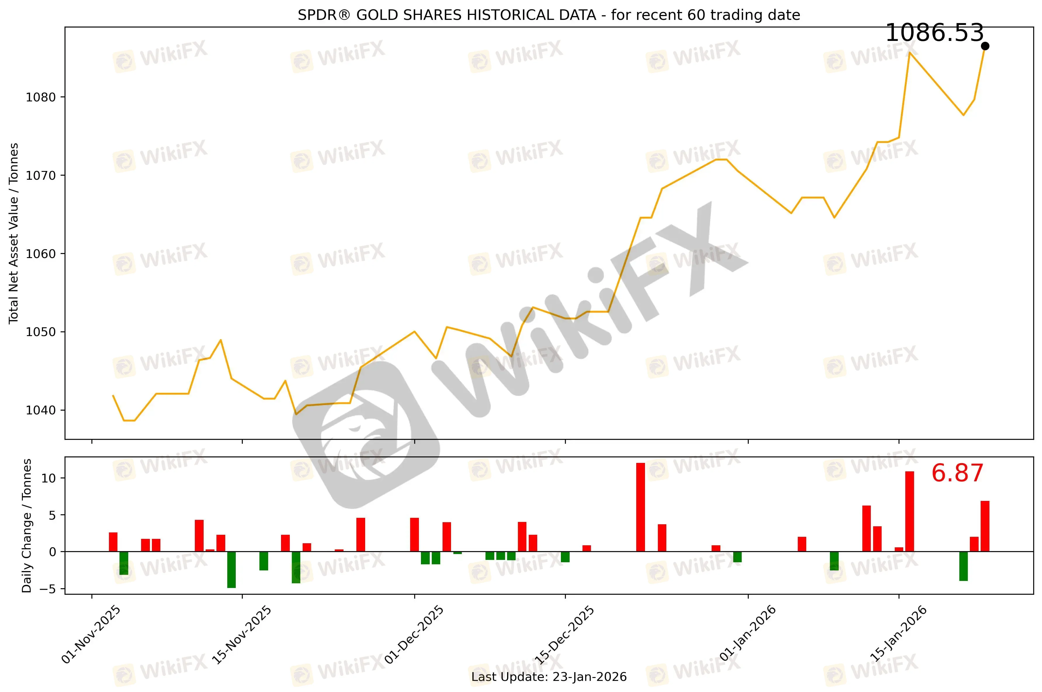 截至2026年1月23日,全球最大的黄金ETF SPDR Gold Trust持仓量为1086.53吨,较上一个交易日增加6.87吨。2026年1月23日现货黄金自4935.96美元/盎司开盘后延续前日涨势,在4960附近受阻,盘中最低向下触及4899.9美元/盎司,随后震荡上行至4989.943美元/盎司,再创历史新高。最终收于4988.17美元/盎司,涨50.03美元或1.01%。