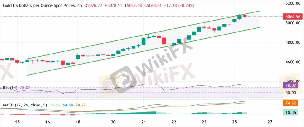 从 $4,464.07 点开始的上升通道支撑着上升趋势,涨幅限制在 $5,101.21 点附近。MACD 保持正值,柱状图开始收缩,表明即使 MACD 线保持在信号线上方,动能也有所减弱。相对强弱指数位于 78(超买),这可能会抑制近期的上行势头,并鼓励在通道边界附近盘整。