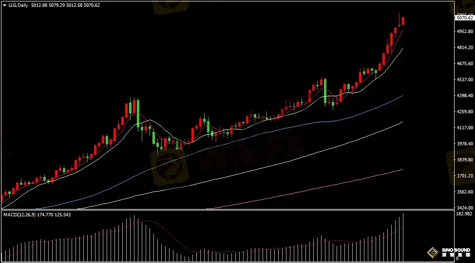 金价日线图看,昨日金价刷新历史高位后回落整理,同时显示金价5100美元上方阻力较大,且短线多头在此存在获利了结心态。昨晚金价回调一度跌破5000美元关口,但随后重新站上5000美元上方,显示该处存在一定支撑力。日线指标看,5日10日均线维持多头向上,MACD指标正动能柱持续增大,RSI指标在84位置附近徘徊。