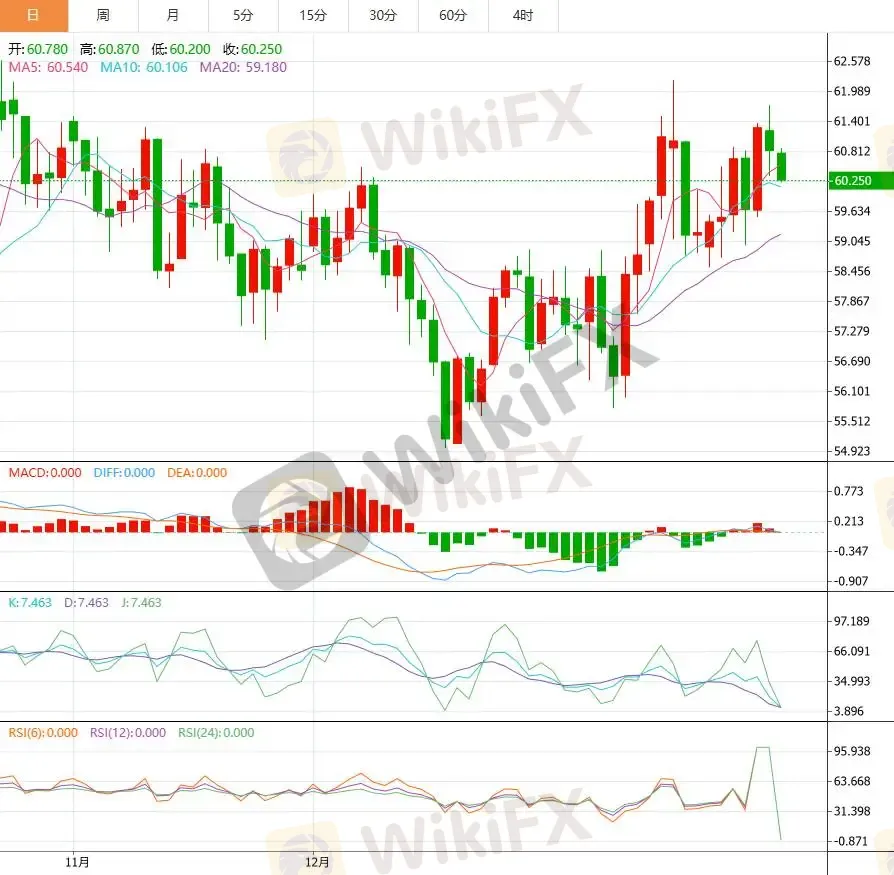 动能指标方面,14 日相对强弱指数自 65 上方温和回落,显示上涨动能放缓但未形成看跌背离,支持油价进入震荡阶段的判断。60 美元关口已成为多空争夺的关键心理与技术支撑位。若价格能于此企稳并伴随量能配合,则有望再度上探 61.80 美元阻力,进而挑战 62.50 – 63.00 美元区间。反之,若有效跌破 59.20 美元,则可能打开下行空间,下一支撑关注 58.00 美元附近。