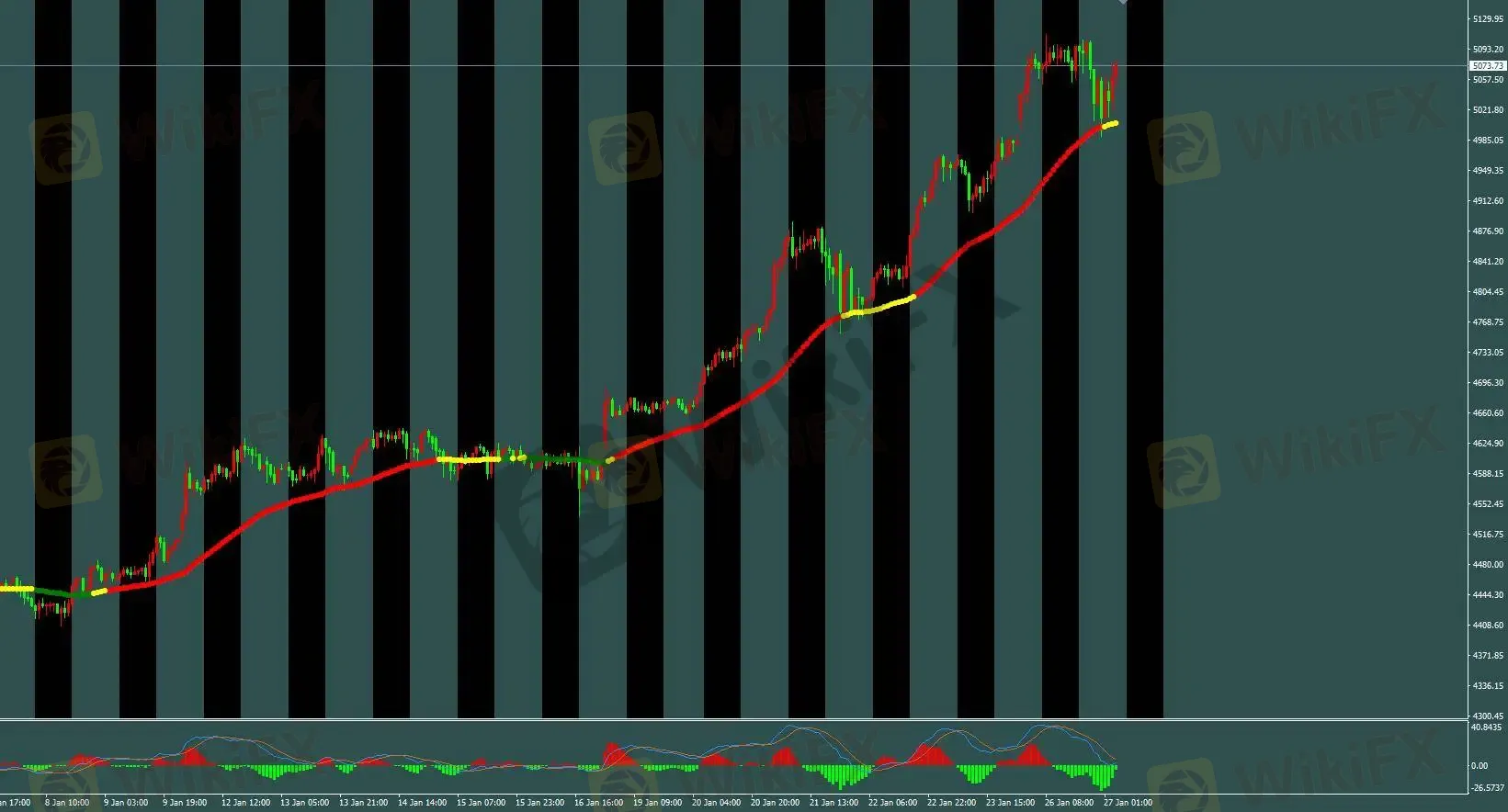 目前三色线已由红转黄,H1 标准多单已于 4773 入场并盈利 200 点出场。今日日内交易可结合 M5 基础运用模型进行操作。