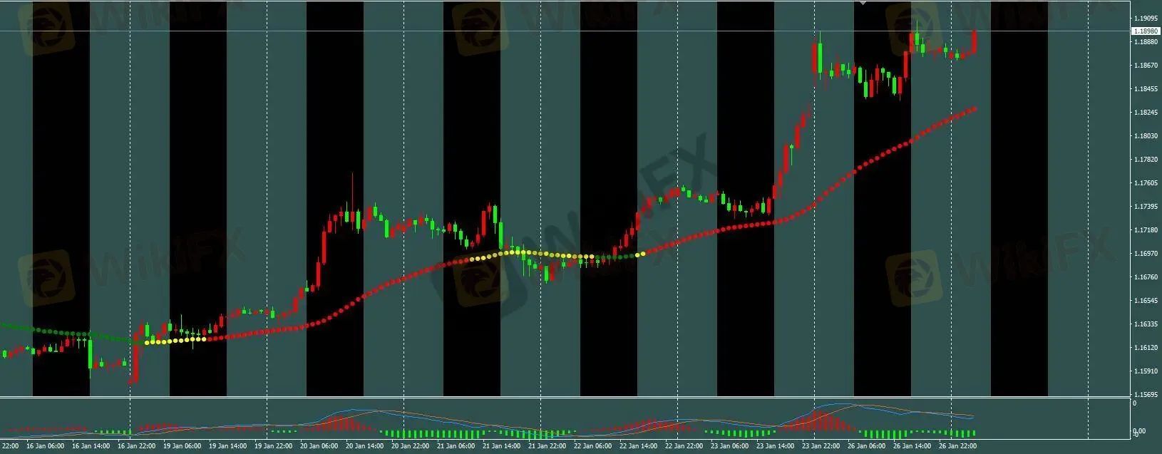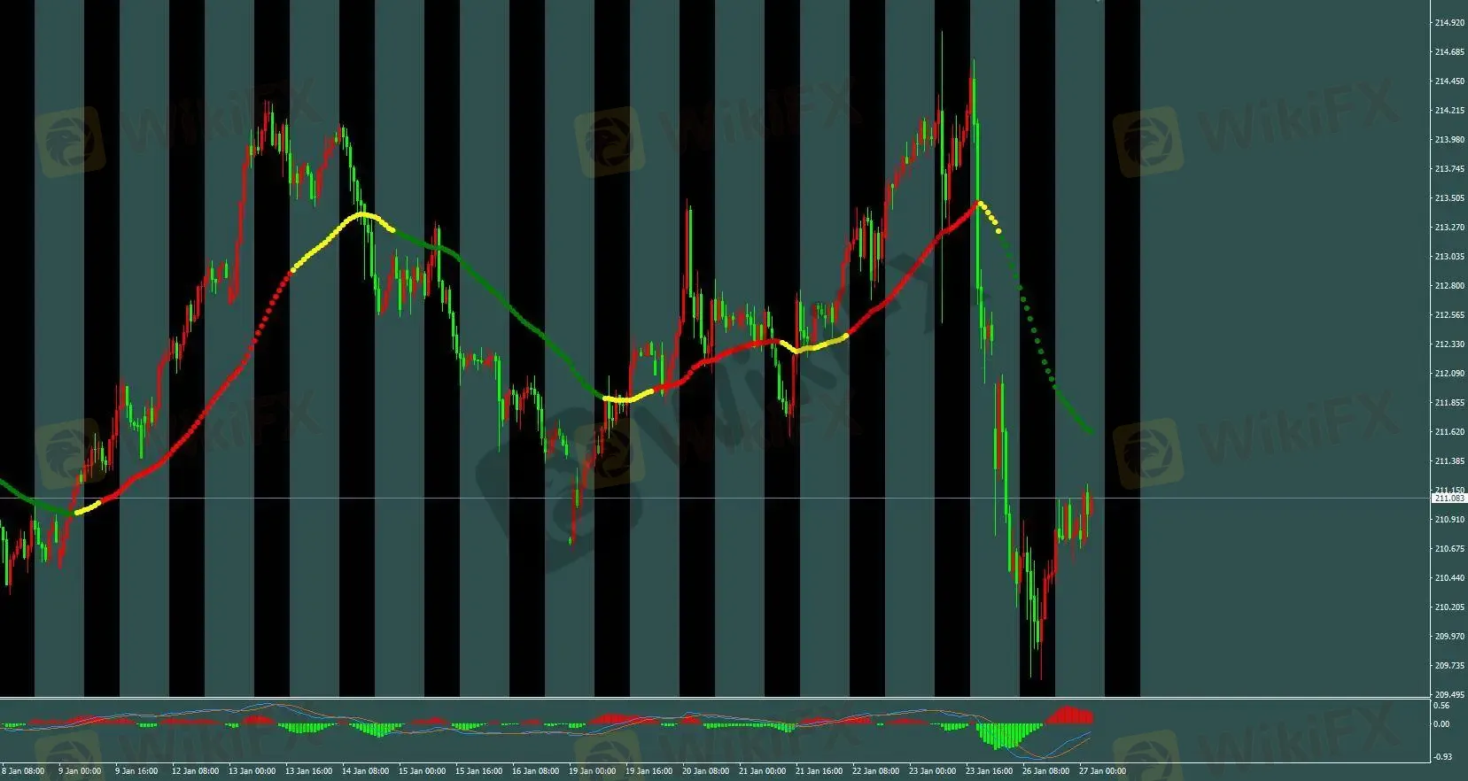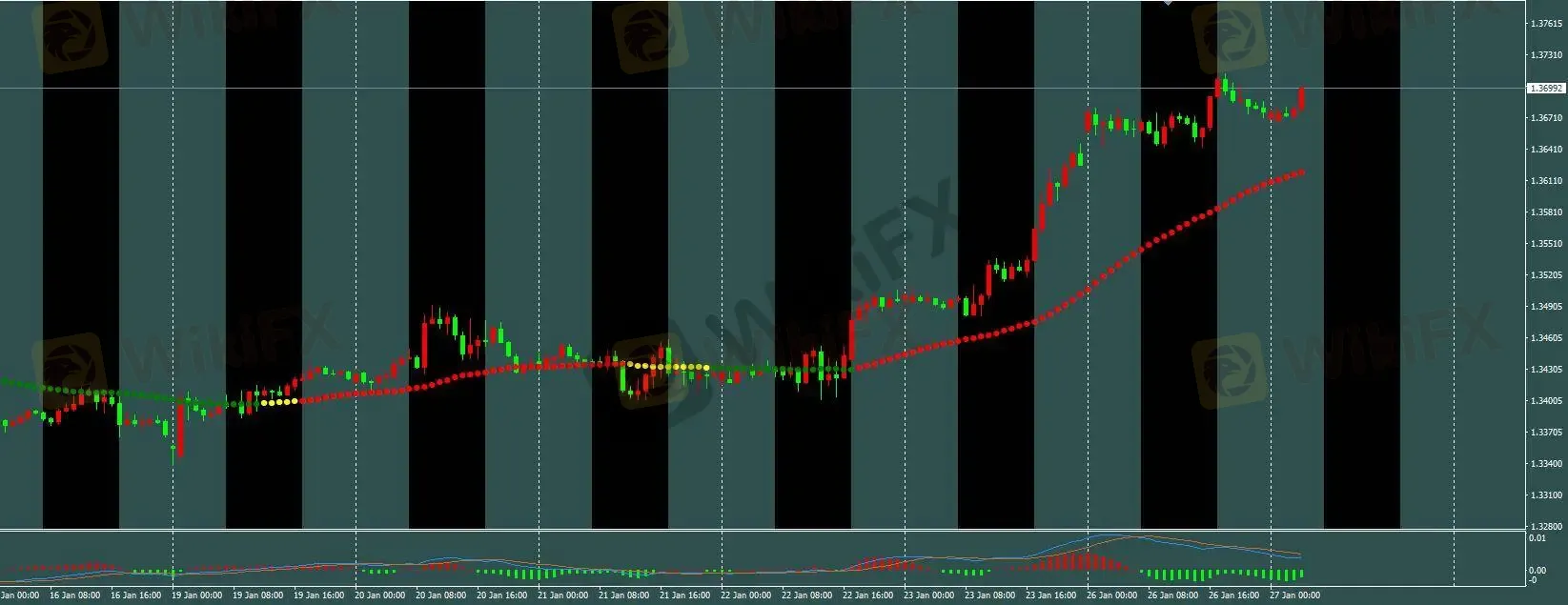 目前三色线维持绿色。需等待价格线接近三色线附近开仓 H1 标准空单,止盈 70 点,保护性止损设于开仓位上方 120 点,或三色线变红即平仓。日内建议根据 M5 基础运用模型操作。