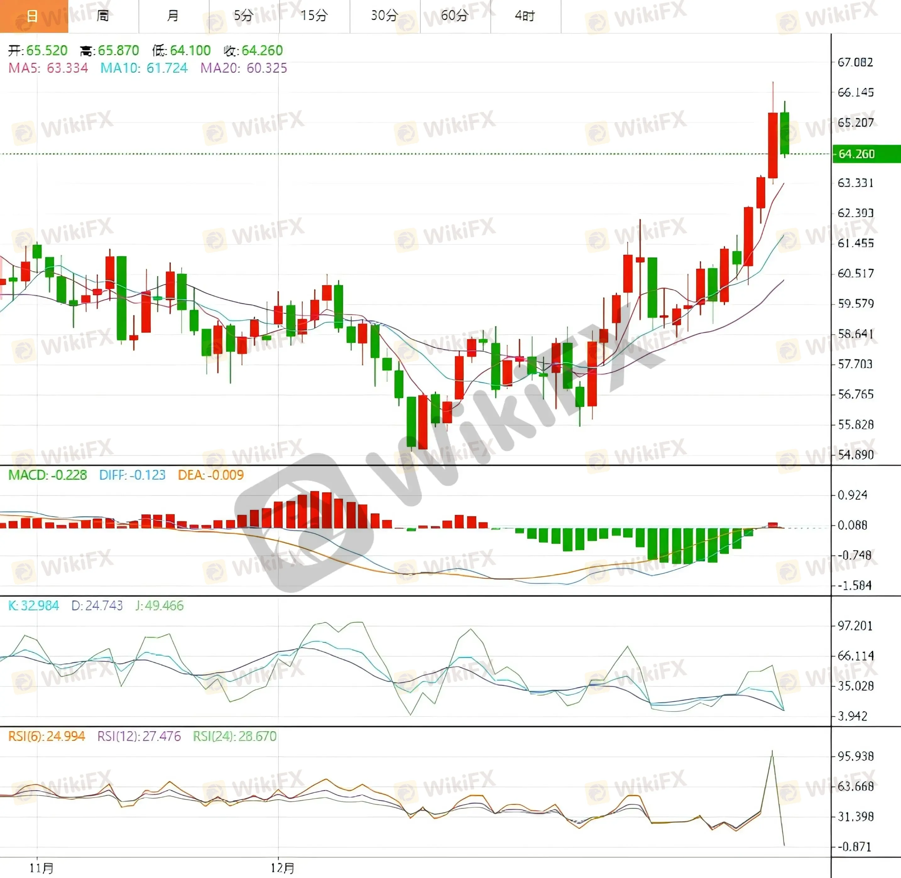 整体来看,WTI 日线仍处于中期震荡偏弱格局,但短期已具备反弹延续条件。若价格能够稳固站上 64.00 美元一线,将有望向 67 美元整数关口发起测试;反之,若地缘风险情绪降温,油价回落至 64 美元上方震荡的概率仍然存在。