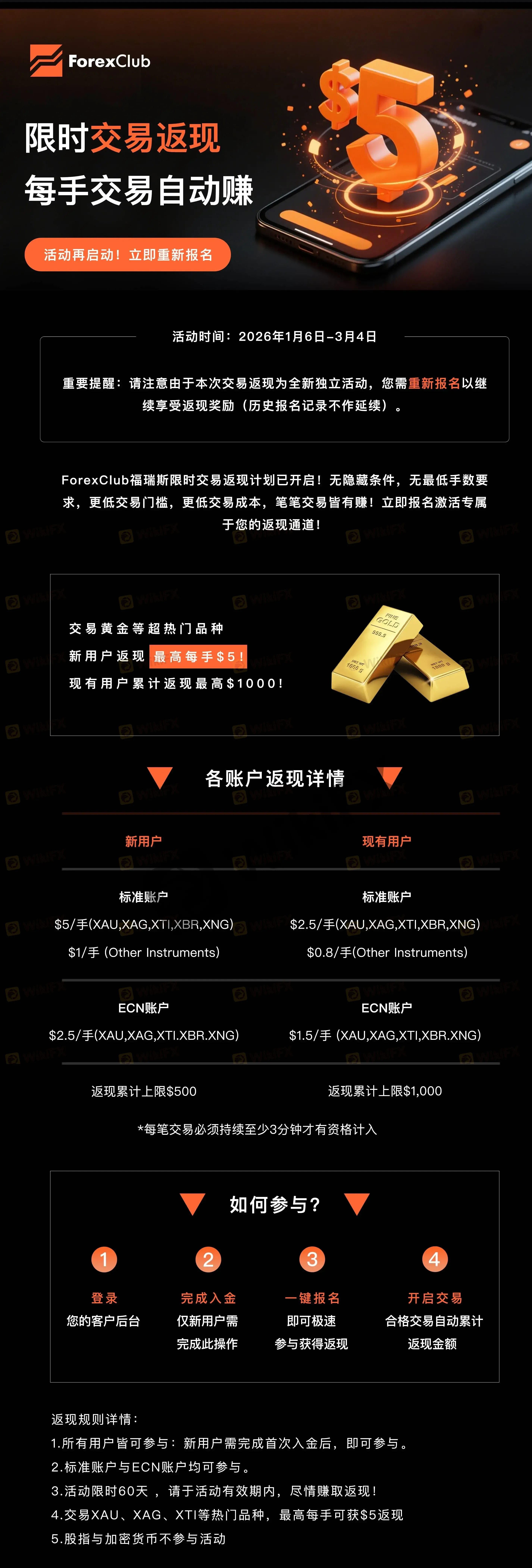 摘要:ForexClub福瑞斯限时交易返现计划盛大开启!——每笔交易自动返现,黄金每手最高返$5!ForexClub福瑞斯限时交易返现计划已开启!无隐藏条件,无最低手数要求,更低交易门槛,更低交易成本,笔笔交易皆有赚!立即报名激活专属于您的返现通道!活动时间:2026年1月6日-3月4日活动详情:活动核心亮点无门槛参与,全用户覆盖!零隐藏条款,透明规则!无论您是新用户还是资深交易者,只需简单操作即可加入