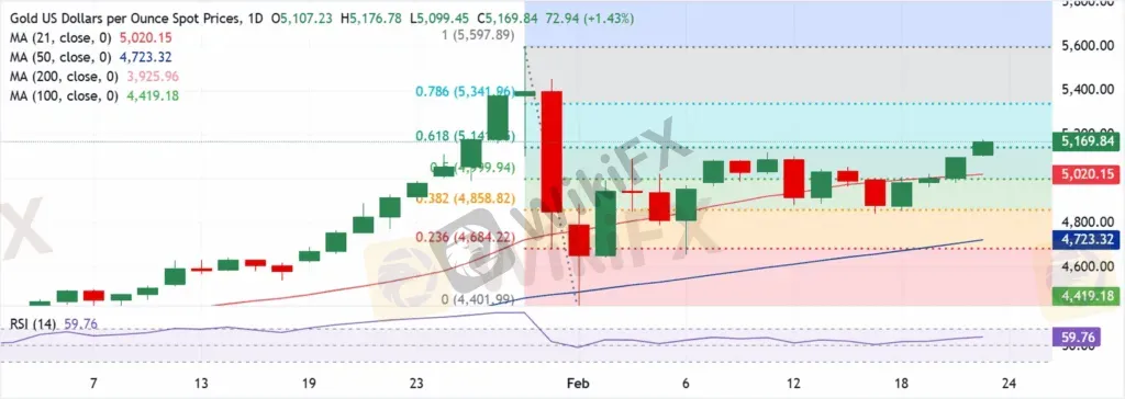 摘要:在贸易、经济和地缘政治忧虑挥之不去的情况下,黄金站在 $5,150 以上的高位。特朗普的关税困境再次引发 ‘卖美国 ’主题,美元舔舐伤口。黄金突破了位于 $5,142 的关键 61.8% Fibo 阻力位,等待日线收盘突破该阻力位。黄金在上周五上涨 21 个交易日后,周一早盘上涨超过 11 个交易日。在关税重启、经济不确定性以及美国与伊朗地缘政治紧张局势迫在眉睫的背景下,买家保持强劲的购买力,令这