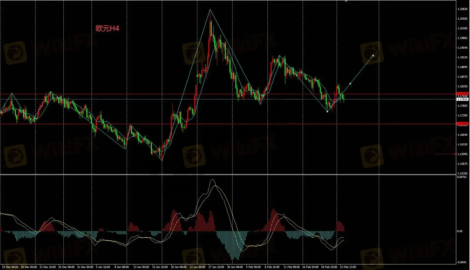 H4图表汇价若不上上破1.18则继续回落至1.175附近。