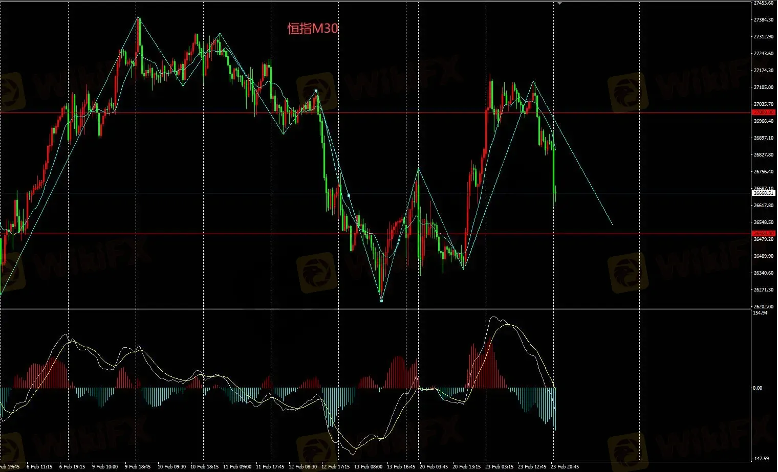 恒生指数冲高后再次回落至27000关口下方,短线多头态势结束,日内持续看空。