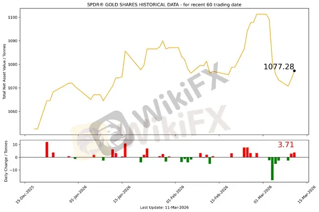截至2026年03月11日,全球最大的黄金ETF SPDR Gold Trust持仓量为1077.28吨,较上一个交易日增加3.71吨。2026年03月11日现货黄金自5187.03美元/盎司开盘后短暂上行至当日高点5223.22美元/盎司,随后全天震荡下行,最低向下触及5149.322美元/盎司。最终收于5176.27美元/盎司,跌14.34美元或0.28%。