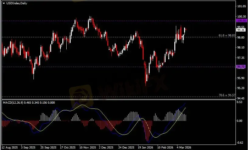 日线图显示美元指数反弹上行,当前收于98.80支撑。从MACD来看,快慢线向上运行,白色动能柱则温和收缩。指数走势和动能柱的变化呈分歧。