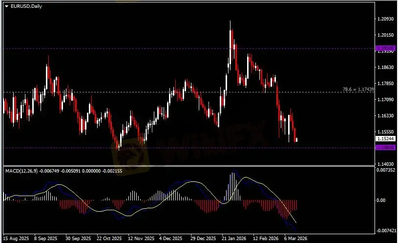 日线图显示欧元兑美元震荡下挫,当前仍收于1.1480支撑。从MACD来看,快慢线向下运行,红色动能柱则温和收缩。汇价走势和动能柱的变化呈分歧。