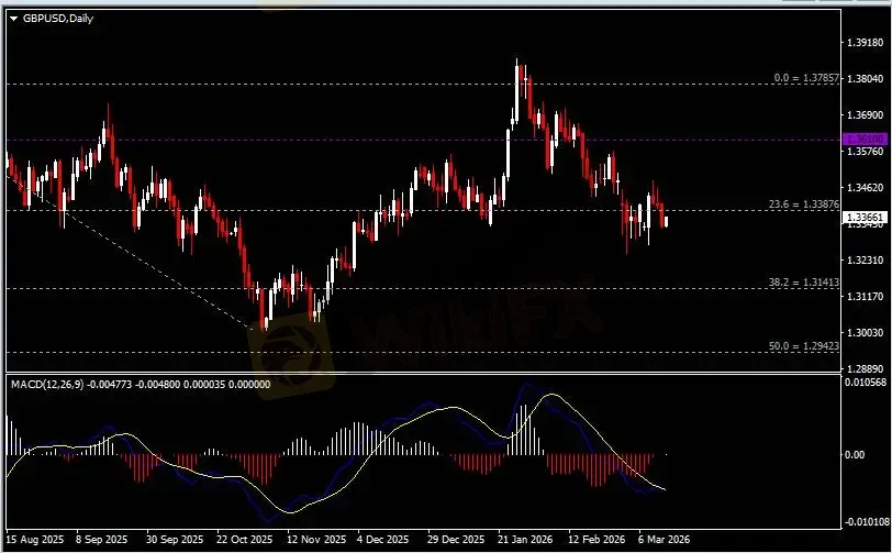日线图显示英镑兑美元震荡下跌,当前收于前低1.3390。从MACD来看,快慢线拐向下行,红色动能柱收缩殆尽。汇价走势和动能柱的变化呈分歧。