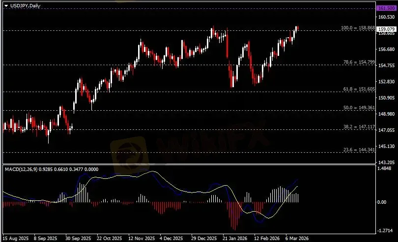 日线图显示美元兑日元震荡上行,当前收于前高158.90。从MACD来看,快慢线向上运行,白色动能柱则温和收缩。汇价走势和动能柱的变化呈分歧。