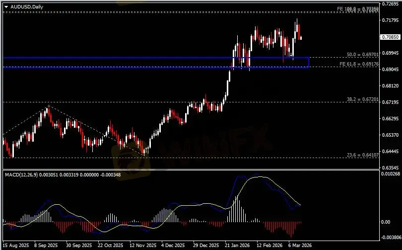 日线图显示澳元兑美元高位回调,当前承压于0.7230阻力。从MACD来看,快慢线拐向下行,红色动能柱则温和收缩。汇价走势和动能柱的变化呈分歧。