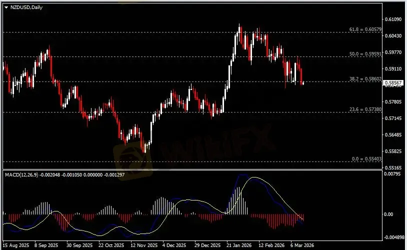 日线图显示纽元兑美元回调下挫,当前测试0.5860支撑。从MACD来看,快慢线向下运行,红色动能柱恢复增量。汇价走势基本和动能柱的变化一致。