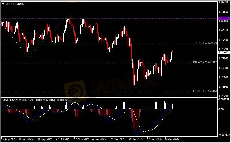 日线图显示美元兑瑞郎强势冲高,当前企稳于0.7770支撑。从MACD来看,快慢线向上运行,白色动能柱温和放量。汇价走势基本和动能柱的变化一致。