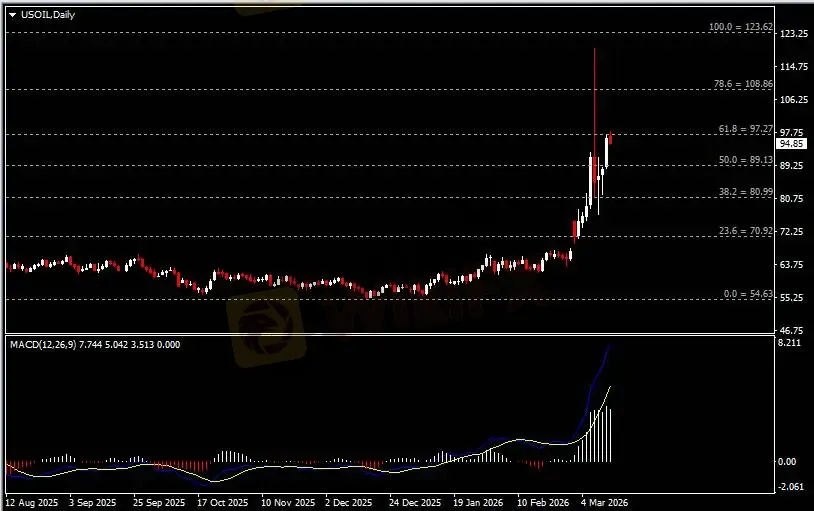 日线图显示油价震荡走强,当前测试突破97.30阻力。从MACD来看,快慢线向上扩张,白色动能柱则略呈收缩。油价走势和动能柱的变化呈分歧。