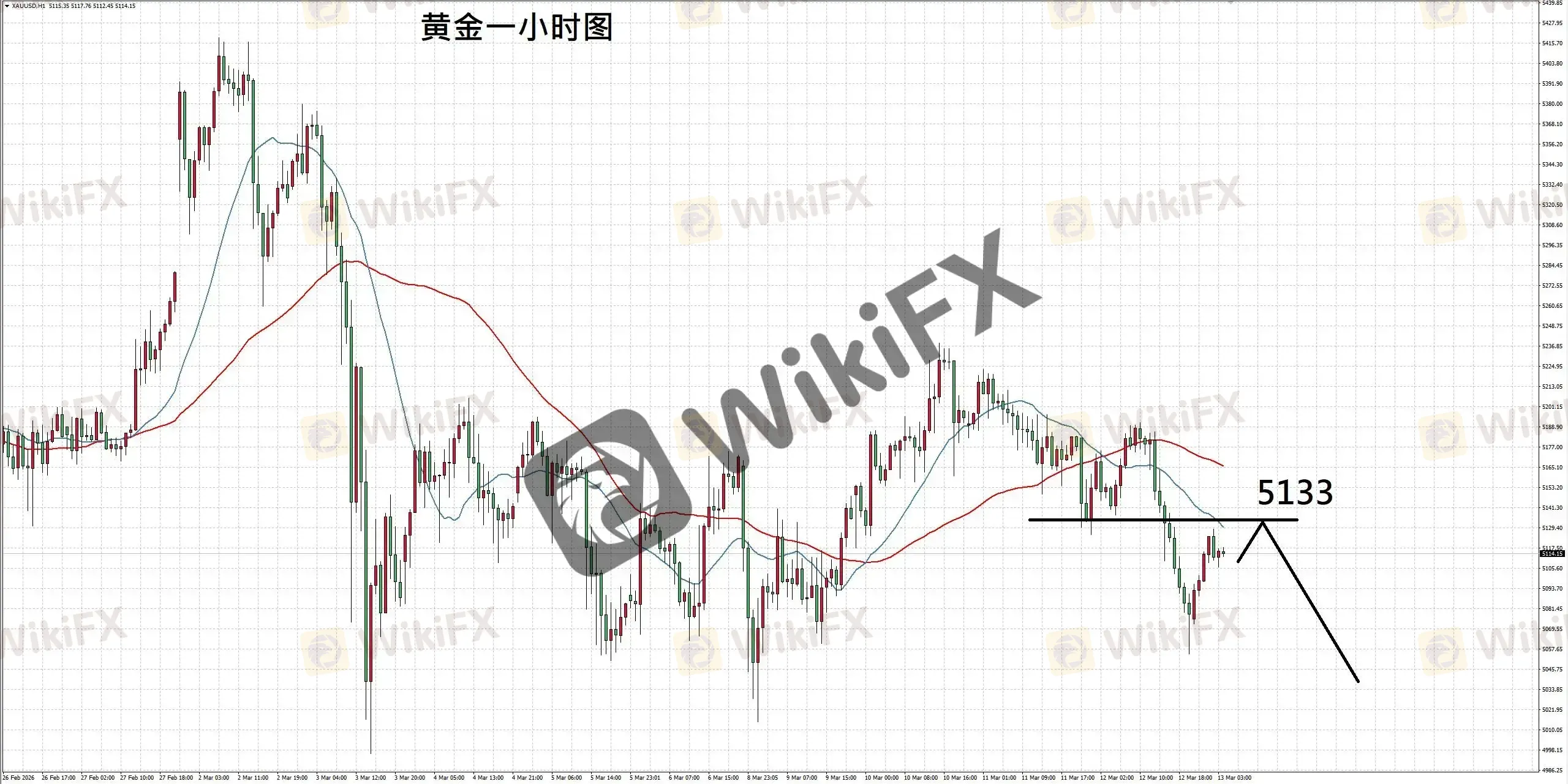 黄金一小时图,走势震荡后向下回落并刷新波段低点,显示短线卖压增强;如后续反弹受阻,则走势或继续向下修正,故建议短空操作。