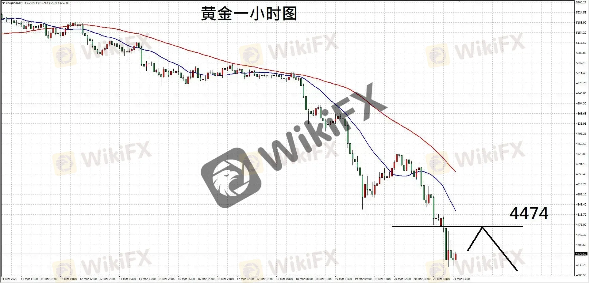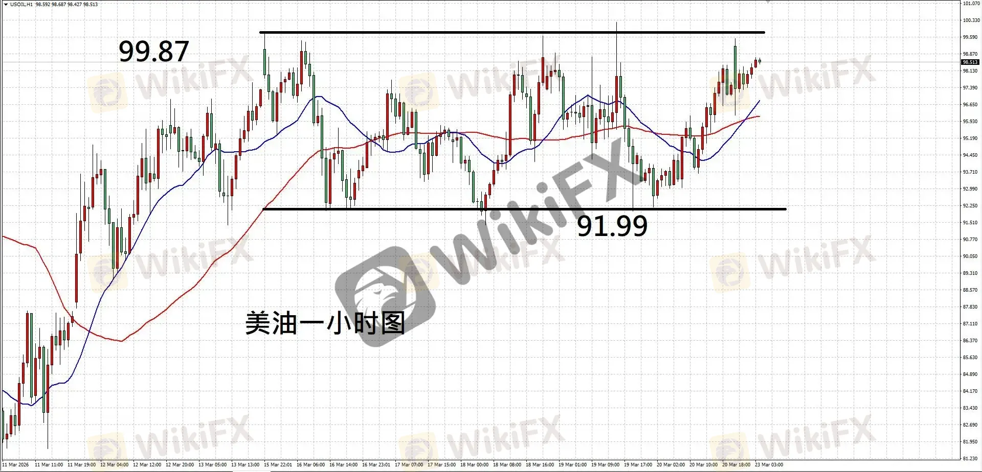 摘要:【基本面分析】美国总统特朗普威胁将对伊朗发电厂展开袭击,以逼迫其重新开放霍尔木兹海峡,局势短期难以落幕,将加剧原油供应中断状况,从而带来更高通胀。然而黄金走势并未受益于避险,主要因美国相较其余地区更能抵御油价波动冲击,导致资金回流美元,加剧黄金抛售压力。【技术分析】黄金一小时图,走势高低点持续下移,均线下弯显示卖压较强;如后续反弹未能突破前期阻力,则走势或继续向下,故建议短空操作。操作建议:建议4